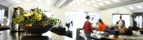 Caféen er beliggende i hjertet af hotellets underetage med udsigt til fjorden.