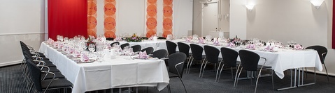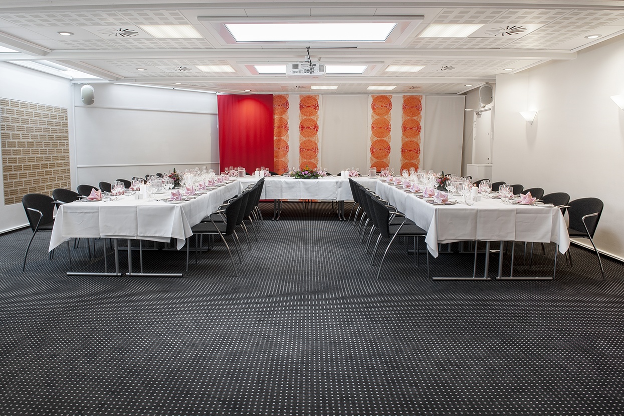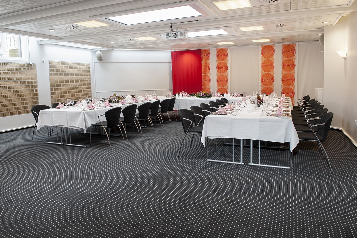 Lokalet er placeret i hovedbygningen med udsigt ud mod gården. Her er et dejligt lysindfald og ligger umiddelbart lige ved husets hyggelige bibliotek og med direkte udgang til husets store terrasse med udsigt over Kolding Fjord.